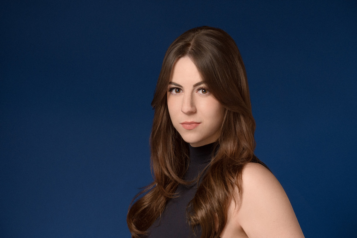 Cover image of Portraits portfolio in Photography work sectionFemale model smiling at the camera in an urban settingFemale model posing in the middle of a downtown street.